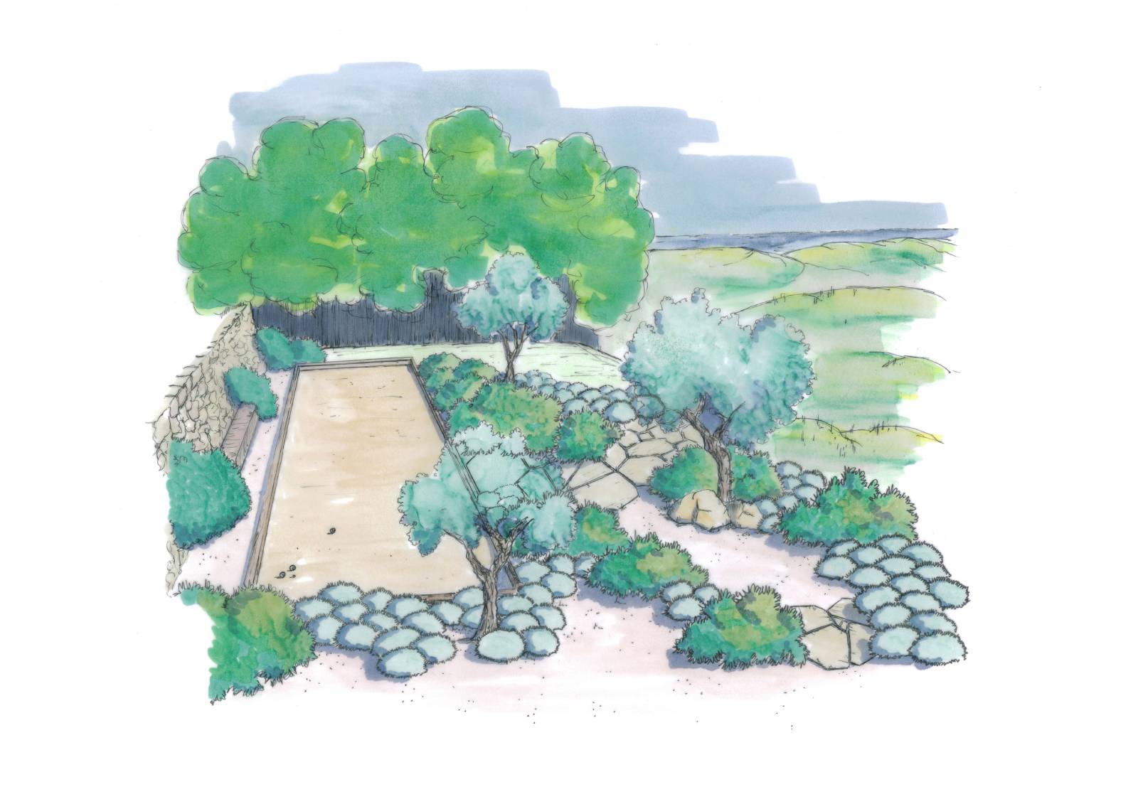 Notre équipe de concepteurs paysagistes dessine ici les premiers traits du projet futur. L'objectif est d'intégrer un jeu de boules, au cœur d'une nature adaptée au site. Utilisons ici des végétaux ayant un faible besoin en eau, comme la lavande, le romarin et l'immortelle d’Italie. Ici, ce seront les parfums de la Provence qui accompagneront nos parties de pétanques.