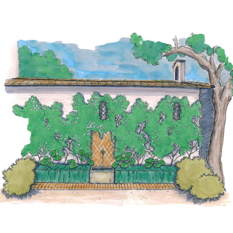 Ici le jasmin étoilé court sur la façade et nous partage son parfum. Une auge en pierre est placée dans l'axe de la perspective pour que le bruit de l'eau participe à la vie du jardin. Les carreaux en zellige reflète la lumière au milieu de ce mur végétal.